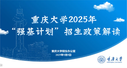 重庆大学是教育部直属的全国重点大学、国家“双一流”建设高校。为深入贯彻落实党的二十届三中全会和全国教育大会精神,按照《教育强国建设规划纲要(2024—2035年)》部署要求,我校2025年继续开展基础学科招生改革试点工作(以下简称“强基计划”),选拔一批有志向、有兴趣、有天赋的青年学生进行专门培养,为国家基础学科和重大战略领域输送后备人才。